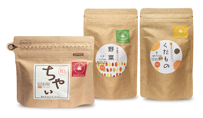「ちゃい」柏のスペシャルチャイ/「野菜」柏の野菜ブレンドティ/「くだもの」柏のくだものブレンドティ